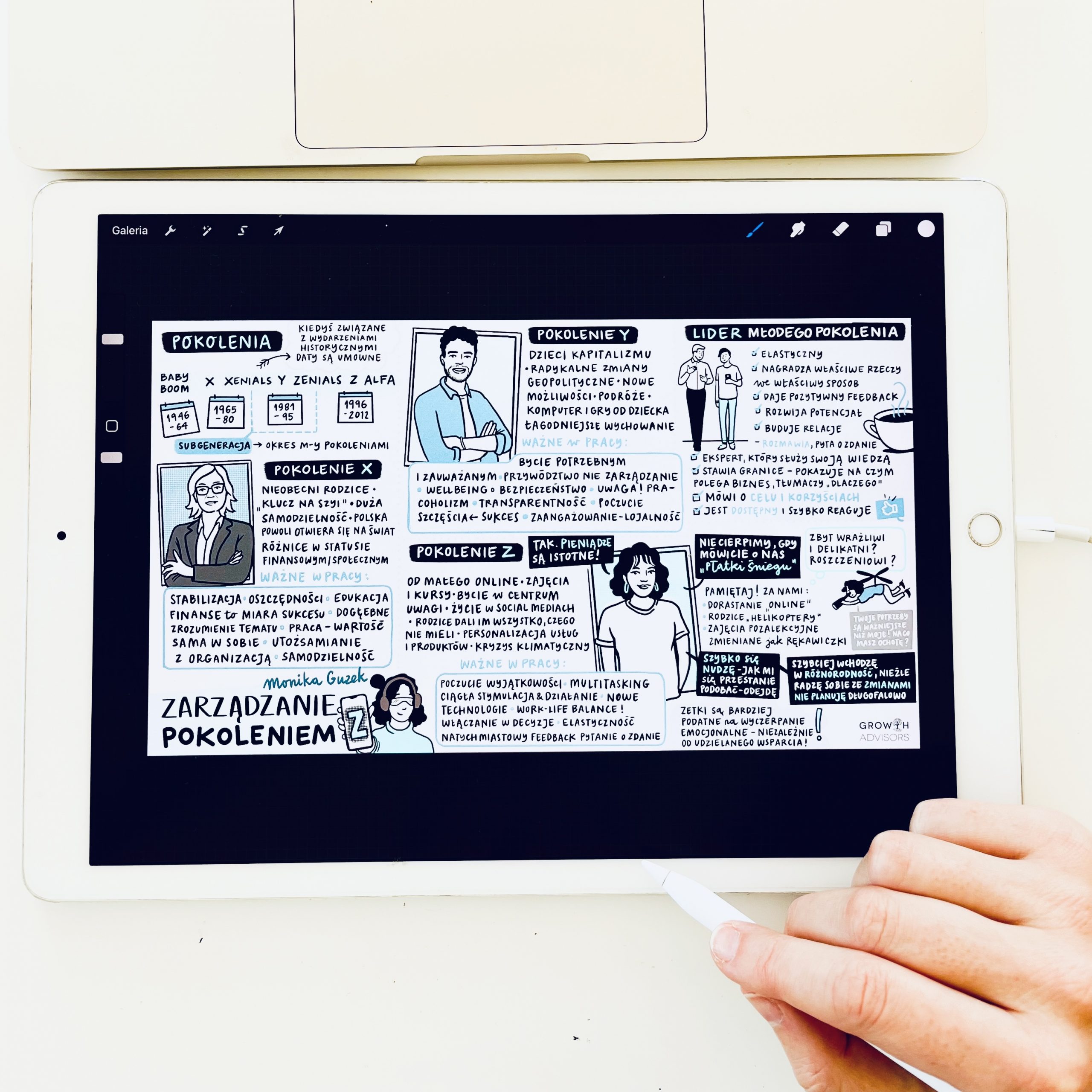 NOTATKA GRAFICZNA  – czyli skondensowana, wzbogacona wizualnie treść przedstawiona zwykle na małym formacie (A4) i najczęściej w formie one-pager’a. Powstaje digitalowo na podstawie materiałów pisanych lub nagrań, zwykle szkoleniowych – będąc graficznym podsumowaniem gdy chcemy, by informacje zostały z odbiorcami na dłużej. Nie trzeba ponownie odsłuchiwać godzinnego webinaru – wystarczy rzut oka, by przypomnieć sobie to, co najważniejsze. Kiedy? Podsumowując SZKOLENIA ONLINE, WEBINARY, ROZDZIAŁY KSIĄŻEK LUB PODRĘCZNIKÓW, jako element E-LEARNINGU.